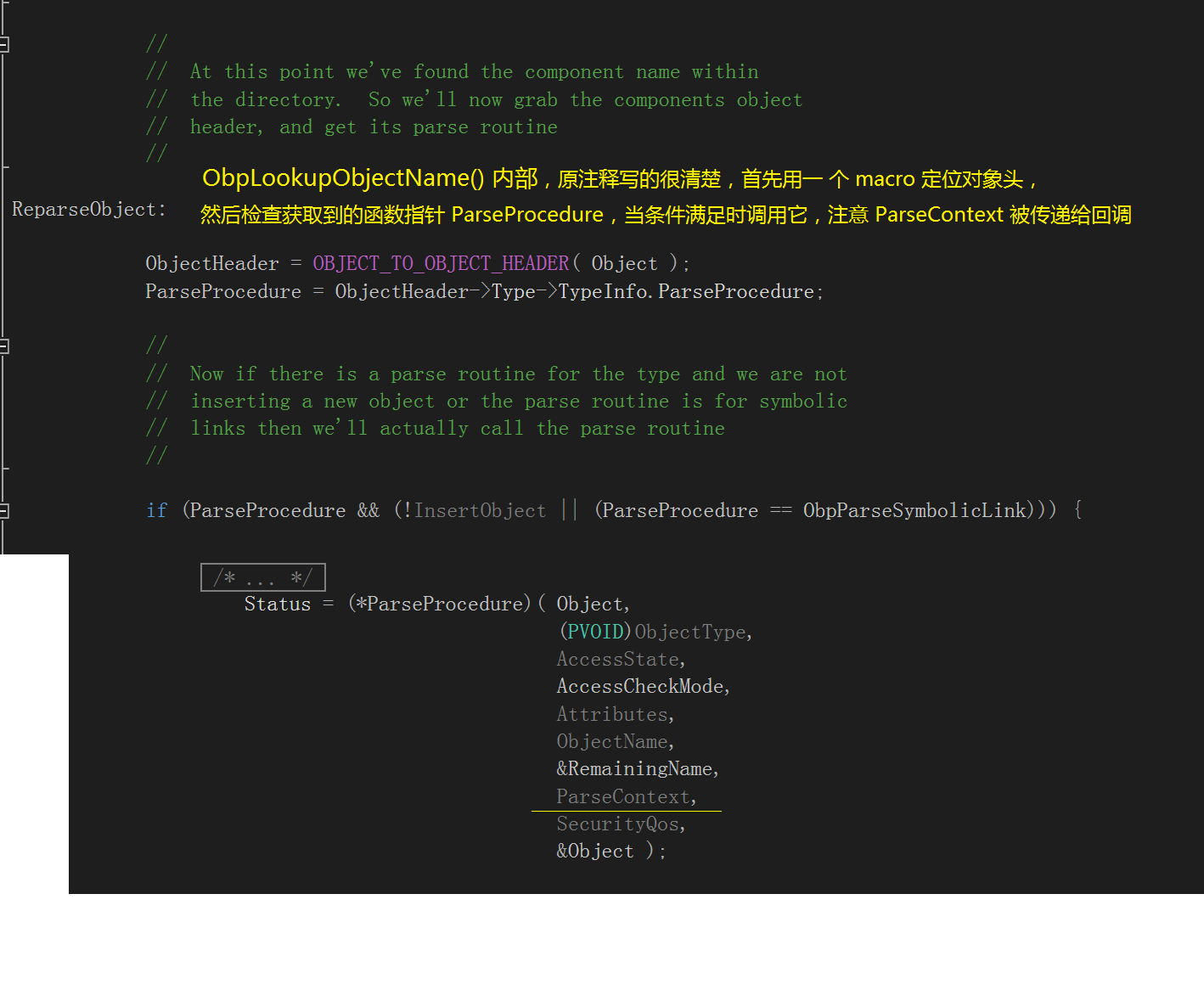还是姑且来看下 ObReferenceObjectByName() 内部究竟干了些什么。ObReference*() 系列的例程多数放在内核源码的“obref.c” 与“obdir.c”