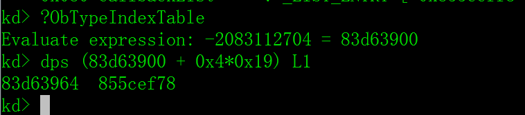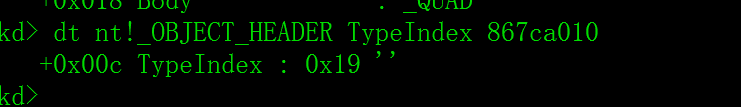 WInodws 内核使用一个数据结构——ObTypeIndexTable 存放有关各种“对象类型”的信息,本质上 ObTypeIndexTable 是一个指针数组,在 32 位体系结构上,每个指针大小 4 字节,而我们得到的索引号为(下标从 0 开始)19,下图中的两条表达式据此计算出该“对象类型”的地址: