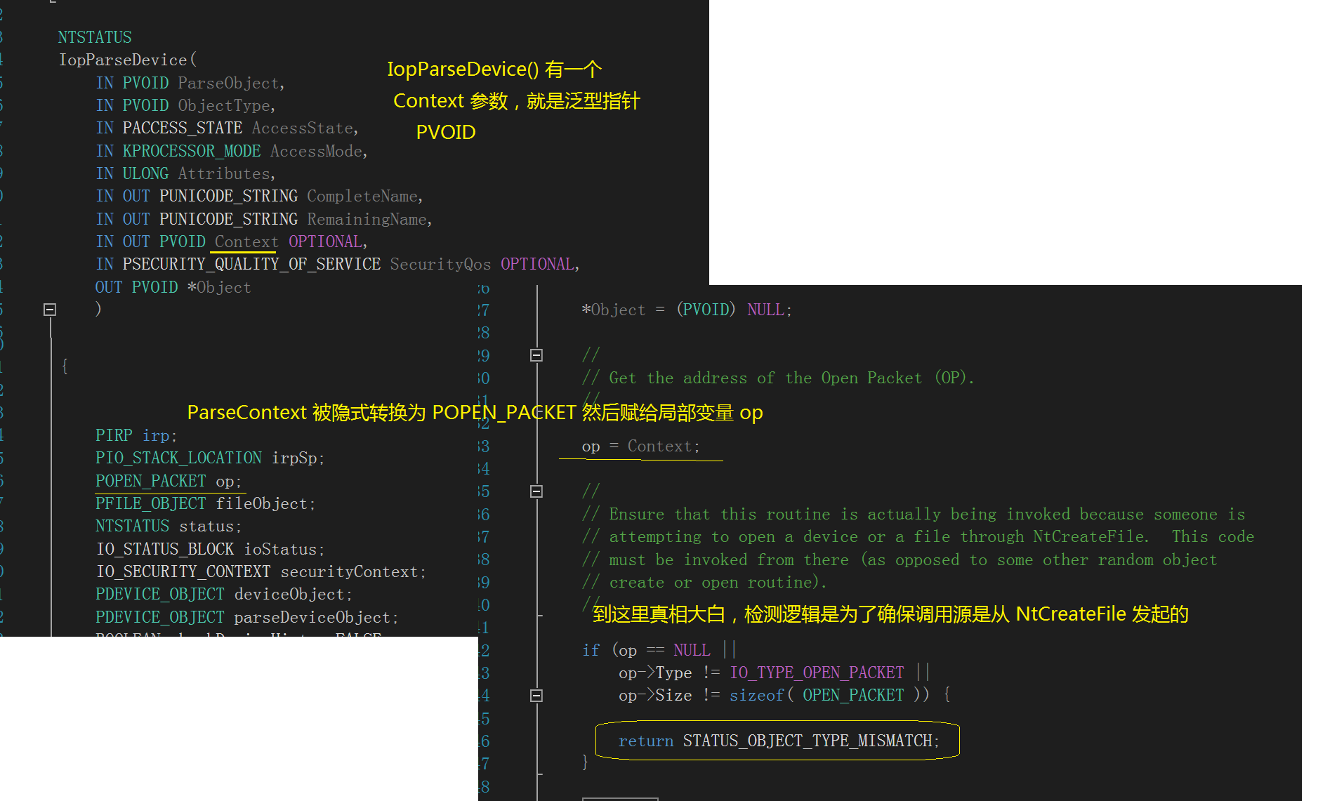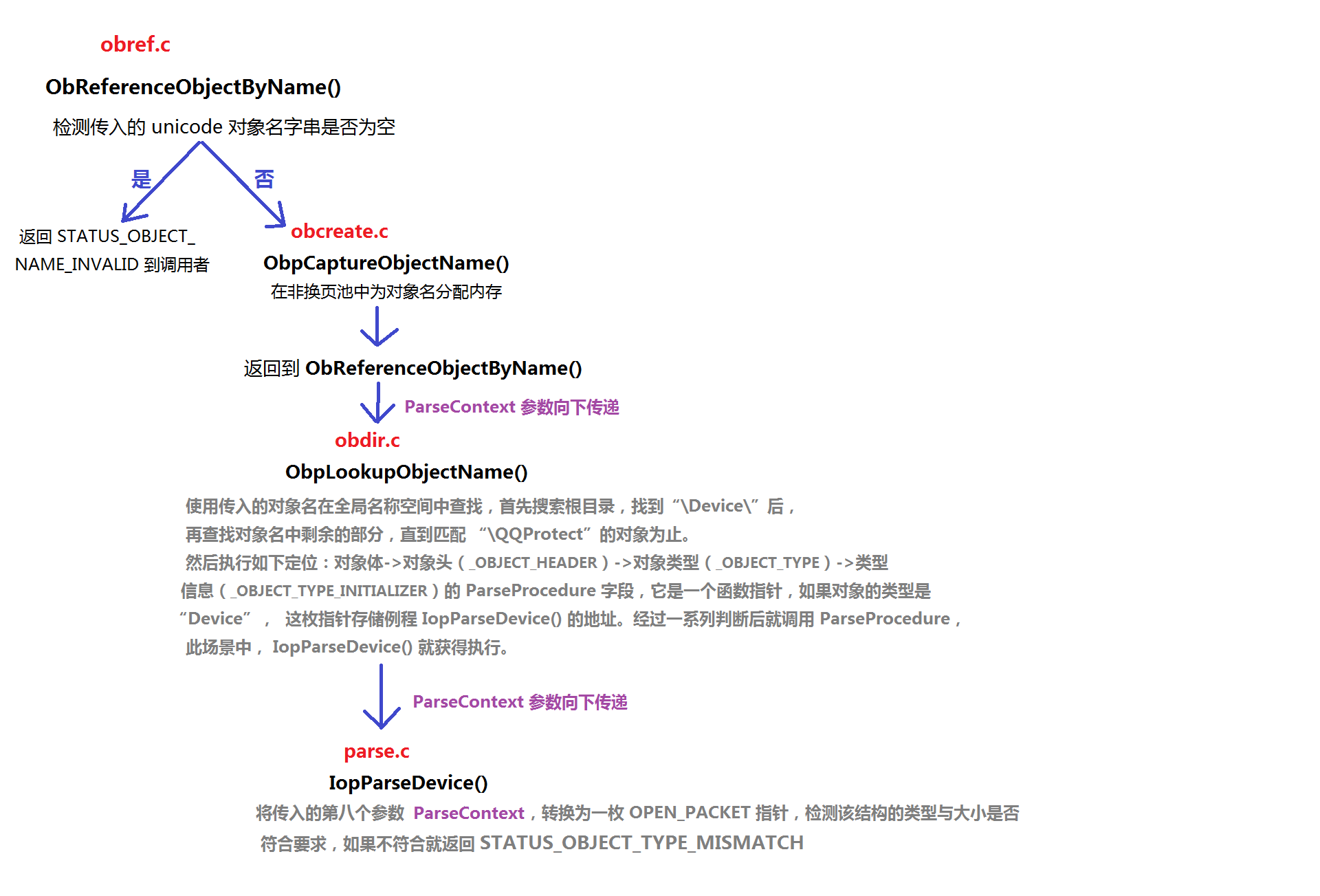 仔细观察前面的图片可知,从最初我调用 ObReferenceObjectByName() 开始,就为它的第七个参数 ParseContext 传入 NULL,而 ParseContext 会在调用链中一路往下传递,最终由 IopParseDevice() 接受并对该参数进行验证,如果它为空,就返回 STATUS_OBJECT_TYPE_MISMATCH。