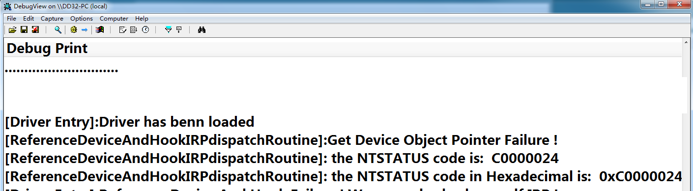 可以看到,在虚拟机中测试时,DbgPrint() 打印返回的状态码为 C0000024(STATUS_OBJECT_TYPE_MISMATCH),也就是对象类型不匹配,如下图所示: