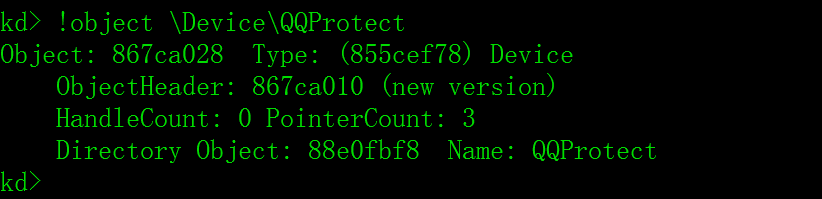 在双击内核调试环境中,首先通过设备名称“\Device\QQProtect”取得相应对象的信息: