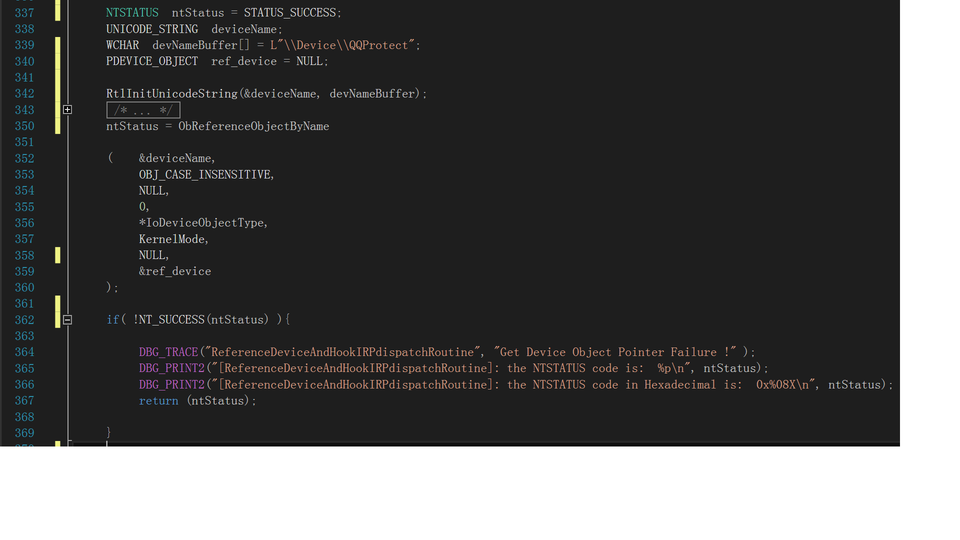 假设我们自己的驱动要获得“\Device\QQProtect”对应的 _DEVICE_OBJECT 指针,然后检查返回的 NTSTATUS 状态码,如下图所示: