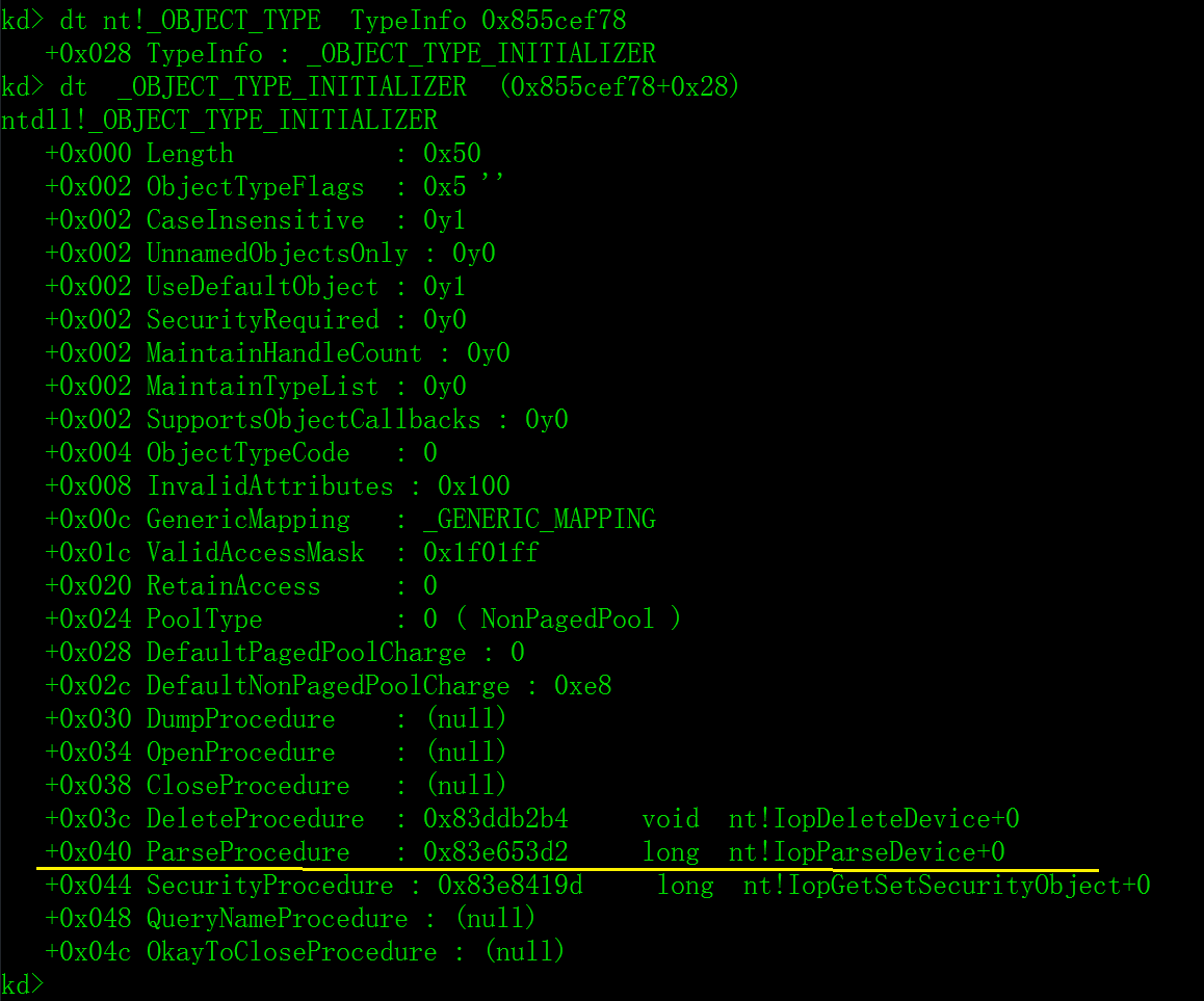 这部分 Patch 就留待后面的随笔再发表。我们当前先要验证“设备”类对象的“ParseProcedure”确实为 IopParseDevice()。。。。。