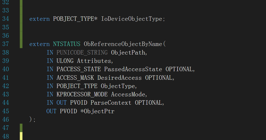 此外,ObReferenceObjectByName() 的第五个参数也是一个未文档化的数据类型(POBJECT_TYPE),所以相关的声明是必须的,如下图所示: