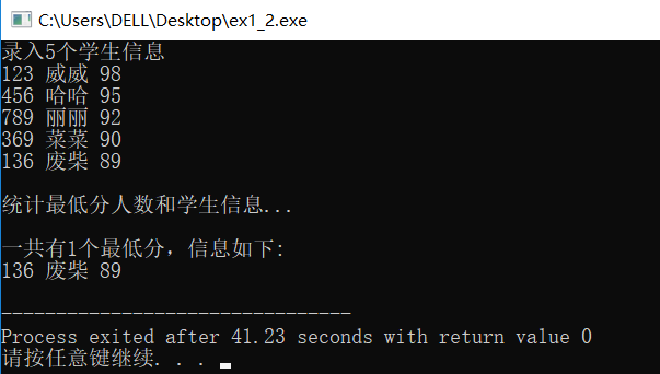 #include <stdio.h> const int N=5; // 定义结构体类型struct student,并定义STU为其别名 typedef struct student { long no; char name[20]; int score; }STU; // 函数声明 void input(STU s[], int n); int findMinlist(STU s[], STU t[], int n); void output(STU s[], int n); int main() { STU stu[N], minlist[N]; int count; printf("录入%d个学生信息\n", N); input(stu, N); printf("\n统计最低分人数和学生信息...\n"); count = findMinlist(stu, minlist, N); printf("\n一共有%d个最低分,信息如下:\n", count); output(minlist, count); return 0; } // 输入n个学生信息,存放在结构体数组s中 void input(STU s[], int n) { int i; for(i=0; i<n; i++) scanf("%ld %s %d", &s[i].no, s[i].name, &s[i].score); } // 输出结构体s中n个元素信息 void output(STU s[], int n) { int i; for(i=0; i<n; i++) printf("%ld %s %d\n", s[i].no, s[i].name, s[i].score); } // 在结构体数组s中,查找最低分学生的记录,将其存入结构体数组s中 // 形参n是结构体数组s中元素个数 // 函数返回最低分的学生人数 int findMinlist(STU s[], STU t[], int n) { int min,i,k=0; min=s[0].score; for(i=1;i<N;i++){ if(s[i].score<min) min=s[i].score;} for(i=0;i<N;i++){ if(min==s[i].score) t[k++]=s[i];} return k; }