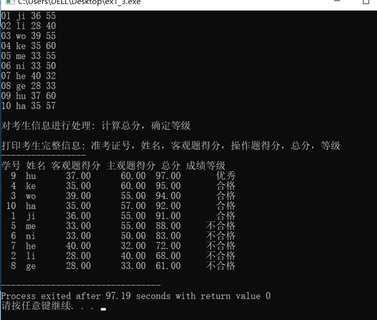#include <stdio.h> #include <string.h> const int N = 10; // 定义结构体类型struct student,并定义其别名为STU typedef struct student { long int id; char name[20]; float objective; /*客观题得分*/ float subjective; /*操作题得分*/ float sum; char level[10]; }STU; // 函数声明 void input(STU s[], int n); void output(STU s[], int n); void process(STU s[], int n); int main() { STU stu[N]; printf("录入%d个考生信息: 准考证号,姓名,客观题得分(<=40),操作题得分(<=60)\n", N); input(stu, N); printf("\n对考生信息进行处理: 计算总分,确定等级\n"); process(stu, N); printf("\n打印考生完整信息: 准考证号,姓名,客观题得分,操作题得分,总分,等级\n"); output(stu, N); return 0; } // 录入考生信息:准考证号,姓名,客观题得分,操作题得分 void input(STU s[], int n) { int i; for(i=0;i<n;i++){ scanf("%d %s %f %f",&s[i].id,s[i].name,&s[i].objective,&s[i].subjective); } } //输出考生完整信息: 准考证号,姓名,客观题得分,操作题得分,总分,等级 void output(STU s[], int n) { int i; printf("-----------------\n"); printf("学号 姓名 客观题得分 主观题得分 总分 成绩等级\n"); for(i=0;i<n;i++) printf("%3d %3s %10.2f %10.2f %3.2f %10s\n",s[i].id,s[i].name,s[i].objective,s[i].subjective,s[i].sum,s[i].level); } // 对考生信息进行处理:计算总分,排序,确定等级 void process(STU s[], int n) { int i,j,t=n*0.1,k=n*0.5;STU temp; for(i=0;i<n;i++){ s[i].sum=s[i].objective+s[i].subjective;} for(i=0;i<n-1;i++) for(j=0;j<n-1-i;j++) if(s[j].sum<s[j+1].sum){ temp=s[j]; s[j]=s[j+1]; s[j+1]=temp;} for(i=0;i<n;i++){ if(s[i].sum>s[t].sum) strcpy(s[i].level,"优秀"); else if(s[i].sum<=s[t].sum&&s[i].sum>s[k].sum) strcpy(s[i].level,"合格"); else if(s[i].sum<=s[k].sum) strcpy(s[i].level,"不合格");} }