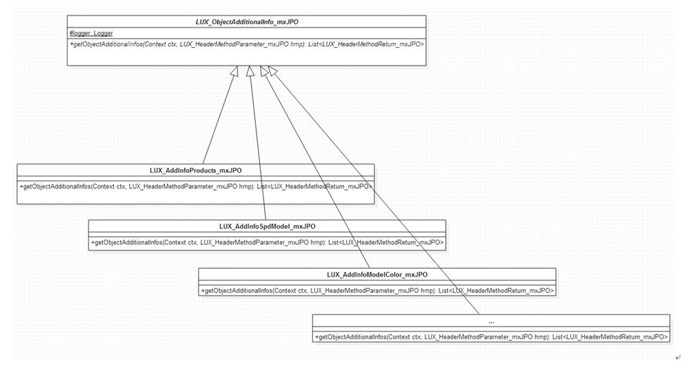 我第一步要做的就是把之前定义在超级大类里面的接口独立出来一个单独的文件用来作为抽象产品的抽象类,然后把之前超大的工厂方法依据不同的代码块分成25个小类; 第二部就是定义一个抽象工厂接口,接口里面有一个create方法负责依据methodName创建那25个对象,该接口有一个具体实现类,该实现类的create方法依然采用工厂方法模式。可惜目前Enovia内核JDK还是1.6的,我无法使用switch(String),只能使用难看的if...else...来解决了。