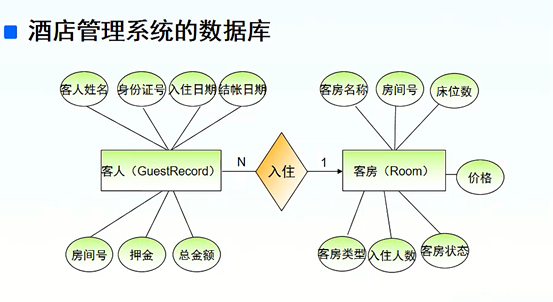 客人: 姓名、身份证、房间号、入住日期、结账日期、押金、总金额