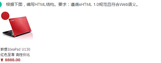<div> <a href="" title="商品的描述,简介"> <img src="" title=" 联想IdeaPad U130 " alt="联想IdeaPad U130产品图"/> <span>联想IdeaPad U130</span> <span>红色至尊 高性价比</span> <strong>¥8888.00</strong> </a> </div>