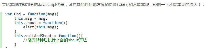 1 var Obj= function(msg){ 2 this.msg = msg; 3 that = this; 4 this.shout = function(){ 5 alert(this.msg); 6 } 7 this.waitandshout = function(){ 8 setTimeout("that.shout()",5000); 9 } 10 } 11 var t = new Obj(); 12 t.waitandshout();