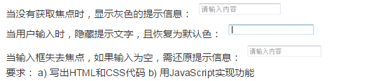 var text = document.getElementsByTagName("input")[0]; text.addEventListener("focus",ofocus,false); text.addEventListener("blur",oblur,false); function ofocus(){ if(this.value=="请输入内容"){ this.value = ""; text.style.color = "#000"; } } function oblur(){ if(this.value ==""){ this.value = "请输入内容"; text.style.color = "#ccc"; } }