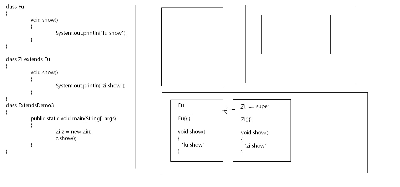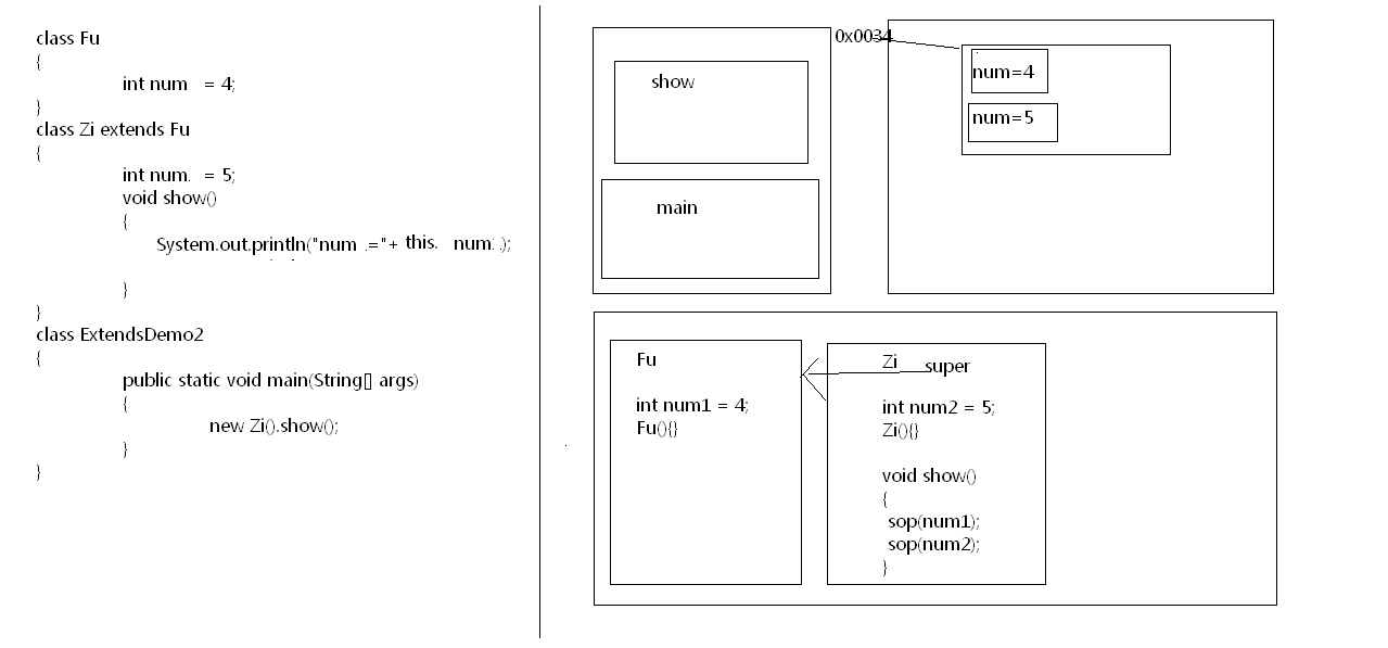 class Fu { { System.out.println("fu's constructor code.... num="+x); } Fu() { x = 8; System.out.println("fu's constructor..... "+getNum()); } int getNum() { return x; } void show() { System.out.println("show ...."+getNum());//9 } } class Zi extends Fu { int y = 4; { System.out.println("zi's constructor code....num="+y); } Zi() { y = 9; } int getNum() { return y; } } //画图求解。 class ExtendsTest { public static void main(String[] args) { new Zi().show(); } }