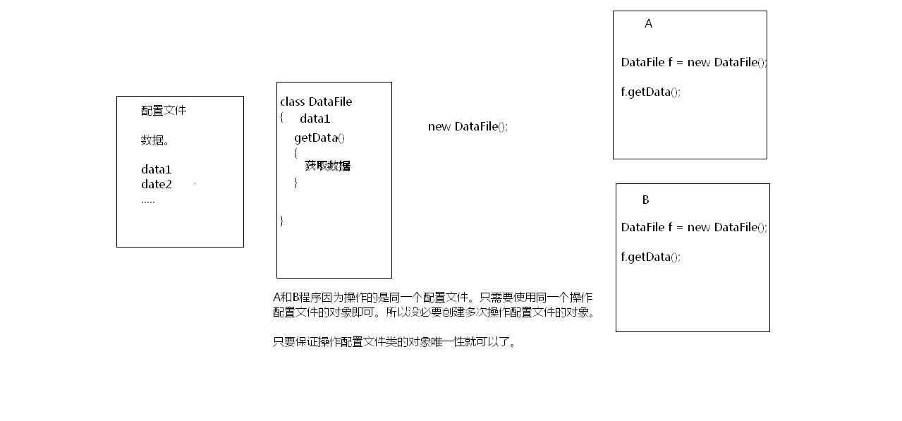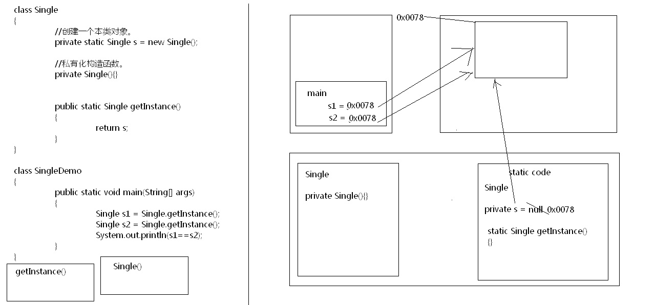 /* 设计模式:对普遍常见问题,通用的解决办法。 23种。其实就是解决问题的思想。 单例设计模式: 解决的问题:保证一个类在内存中的对象唯一性。 如何保证一个类的对象唯一性呢? 思路: 1,不让其他程序创建该类对象。 2,其他程序不能创建,只有在本程序中创建一个对象。 3,将自定义的对象提供给其他程序访问。 步骤: 1,私有化构造函数。 2,自己new一个本类对象。 3,对外提供一个方法可以获取到这个对象。 */ //饿汉式 class Single { //创建一个本类对象。 private static Single s = new Single(); //私有化构造函数。 private Single(){} //对外提供方法,让其他程序获取该对象。 //结果?Single //参数/ 无。 public static Single getInstance() { return s; } } class SingleDemo { public static void main(String[] args) { Single s1 = Single.getInstance(); Single s2 = Single.getInstance(); System.out.println(s1==s2); } }