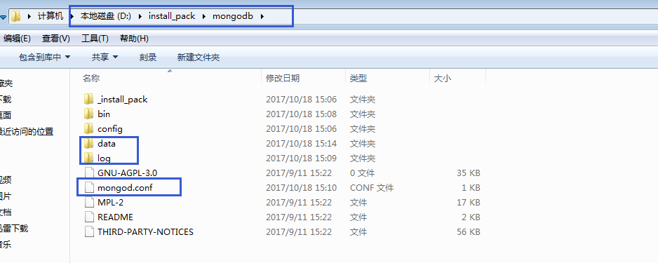 1.新建文件夹data(文件夹内再建一个名称为db的文件夹)、新建文件夹log(新建mongodb.log文件)