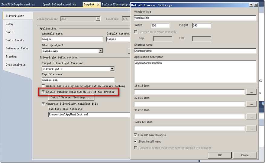 右键Silverlight 项目->属性 打开项目属性窗口,如下图,然后选中红色框的复选框,注意XAP缓存和浏览器外运行是冲突的
