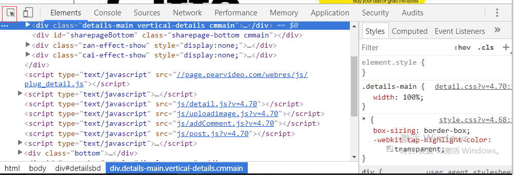 选择如下框起区域,此时再将鼠标移动至自己感兴趣位置,控制台中会出现整个网页的源码,找到地址