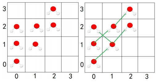 这个二维平面可以看做一个类似棋盘的东西,每个格子可以容纳一个水分子,左下角的格子为$(0,0)$,这个格子右边的格子为$(1,0)$,上方格子为$(0,1)$,以此类推。