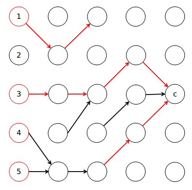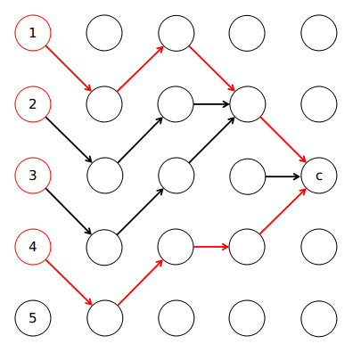 如下图所示,我们只用从红边走回去,黑边不用走,找到上界点$1$和下界点$4$,所以点$1,2,3,4$都受影响,然而点$5$不受影响。
