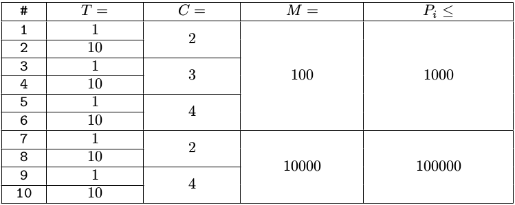 对于所有数据,$1\leqslant T\leqslant 5,2\leqslant C\leqslant 4,1\leqslant M\leqslant 10,000,1\leqslant P_i\leqslant 100,000,0\leqslant X_i<C−1$。