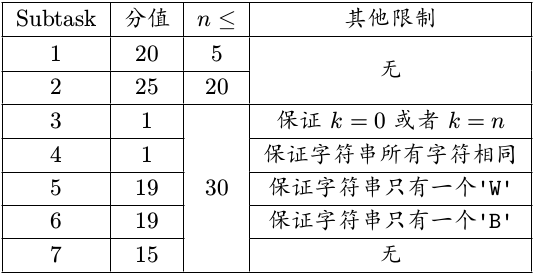 第二行,一个长度为$n$、仅由$'W'$和$'B'$组成的字符串,第$i$个字符代表第$i$个球的颜色,$'W'$为白色,$'B'$为黑色。