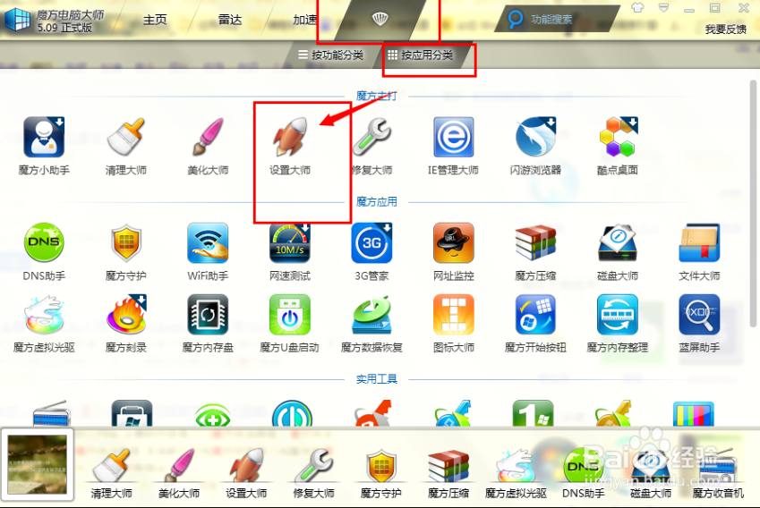 2、打开后选择右上角的功能——设置大师。