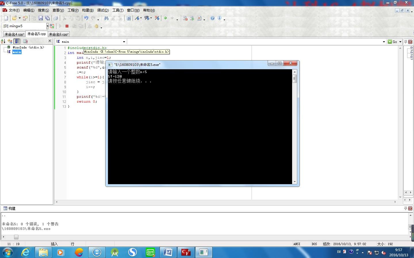 printf("%d!=%d\n,n,jiec");