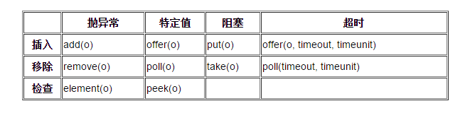 BlockingQueue 具有 4 组不同的方法用于插入、移除以及对队列中的元素进行检查。如果请求的操作不能得到立即执行的话,每个方法的表现也不同。这些方法如下: