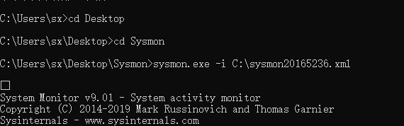 2、以管理员身份打开命令行,使用指令Sysmon.exe -i C:\sysmon5236.xml安装sysmon,