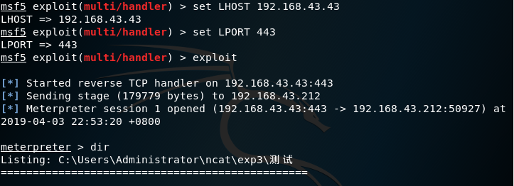 4、打开之前实验3植入的20165236shellcode.upxed.exe后门,Kali用meterpreter回连,可以看到连接的信息,
