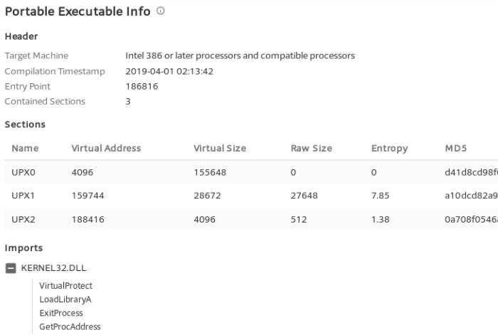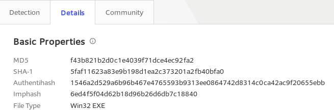 该恶意代码的基本属性如下,可以看出它的SHA-1、MD5摘要值、文件类型、文件大小 等等: