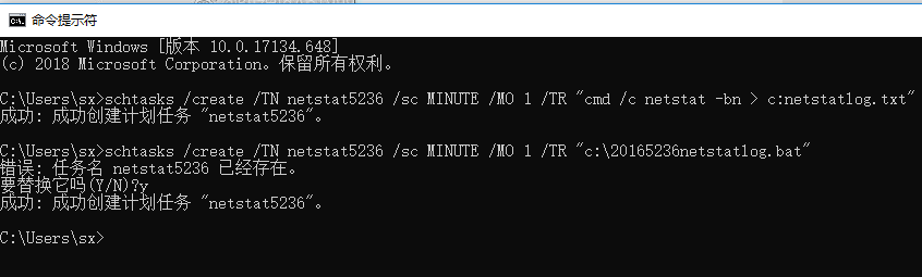 7、输入schtasks /create /TN 20165236netstat /sc MINUTE /MO 1 /TR "c:\20165236netstatlog.bat",记录每隔两分钟计算机的联网情况: