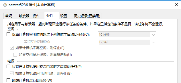 6、在属性中“条件”选项中“电源”栏中,取消勾选“只有计算机使用交流电源才启动此任务”,防止电脑断电任务就停止: