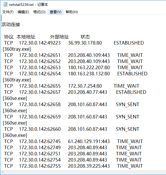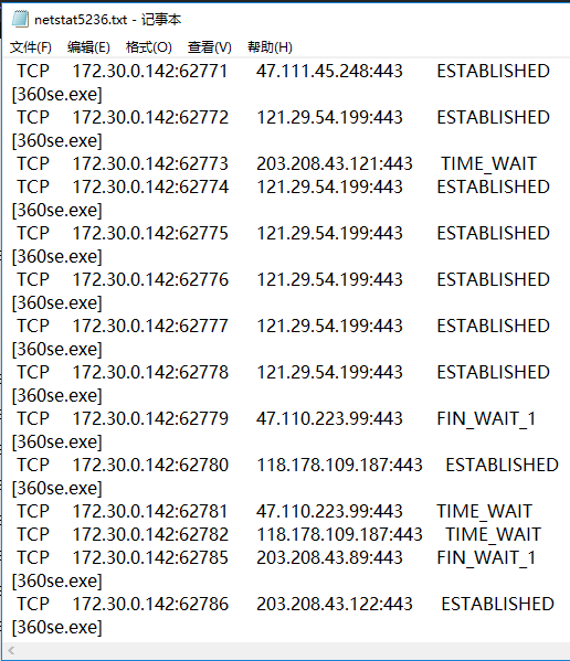 8、运行此任务一段时间,在C盘打开创建的netstat5236.txt,查看本机在该时间段内的联网记录:
