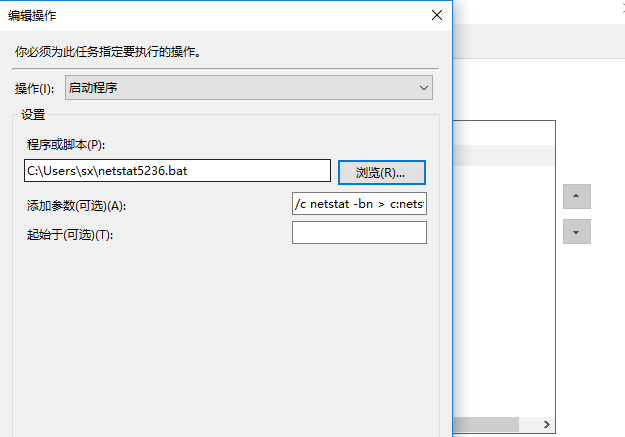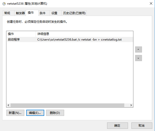 4、打开这个任务,点击操作并编辑,将“程序或脚本”改为我们创建的netstat5236.bat批处理文件,然后确定,如图所示: