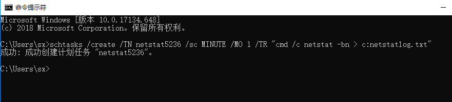 输入:schtasks /create /TN netstat5236 /sc MINUTE /MO 5 /TR "cmd /c netstat -bn > c:\netstat5236.txt"命令,创建计划任务netstat5236,