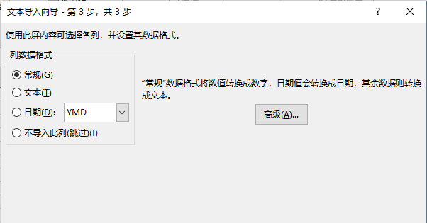 11、点击“下一步”,选全部分隔符号,点击“下一步” ,列数据格式选择常规,点击“完成”: