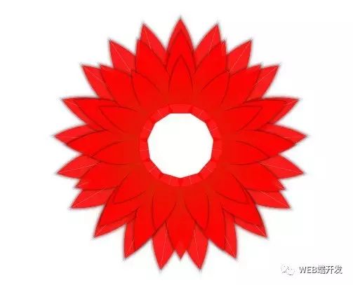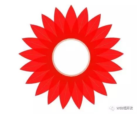 1 function addPetal(){ 2 var len = 21 , 3 i = 0 , 4 scale = 1 , 5 var fragment = document.createDocumentFragment(); 6 for(i = 0 ; i < len ; i ++){ 7 fragment.appendChild(getOnePetal(scale,Math.round(360/len*i))); 8 } 9 box.appendChild(fragment); 10 } 11 function getOnePetal(size,deg){ 12 var div = document.createElement("div"); 13 div.className = "petal" ; 14 div.innerHTML = "<div><div></div></div><div><div></div></div>"; 15 div.style.left = 155 + "px"; 16 div.style.top = 0 ; 17 div.style.transform = "rotate("+deg+"deg) scale("+size+")"; 18 return div ; 19 }