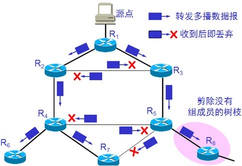 - 路由器收到多播数据报时,先检查是否从源点经最短路径传送来的.若是,就向所有其他方向转发刚才收到的多播数据报(但进入的方向除外),否则就丢弃而不转发