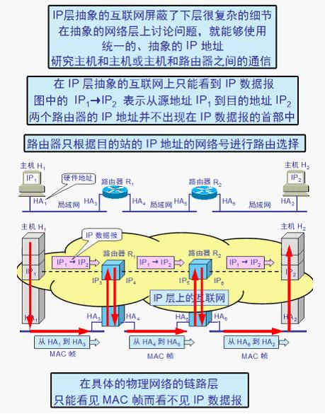 - IP 数据报的首部中没有地方可以用来指明"下一跳路由器的 IP 地址".当路由器收到待转发的数据报,不是将下一跳路由器的IP地址填入IP数据报,而是送交下层的网络接口软件.网络接口软件使用ARP负责将下一跳路由器的IP地址转换成硬件地址,并将此硬件地址放在链路层的MAC帧的首部,然后根据这个硬件地址找到下一跳路由器