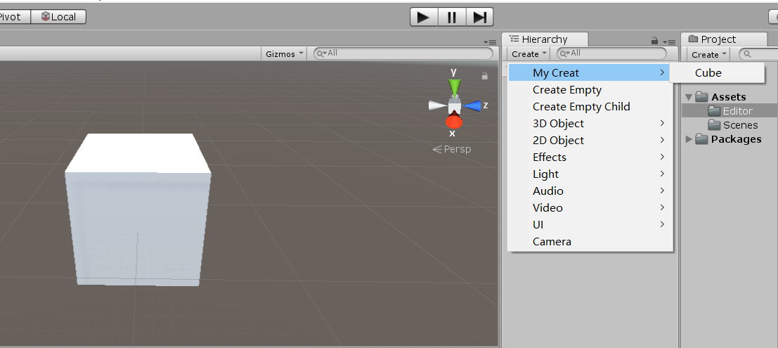 using UnityEngine; using UnityEditor; public class 拓展菜单 { [MenuItem("GameObject/My Creat/Cube", false, 0)] static void CreatCube() { //创建立方体 GameObject.CreatePrimitive(PrimitiveType.Cube); } }
