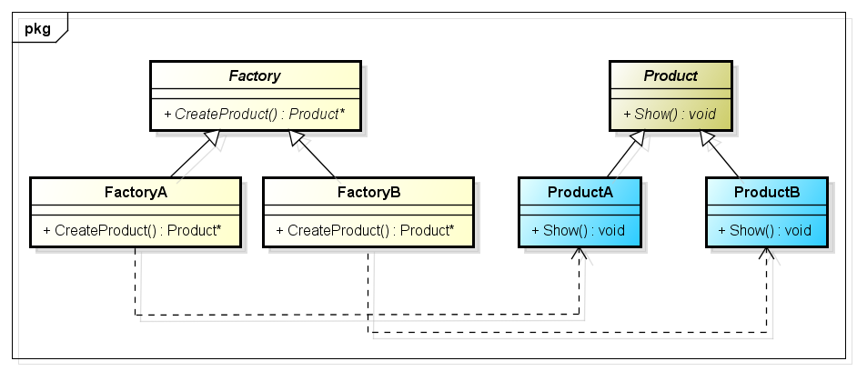 #include <iostream> using namespace std; class Product { public: virtual void Show() = 0; }; class ProductA : public Product { public: void Show() { cout<< "I'm ProductA"<<endl; } }; class ProductB : public Product { public: void Show() { cout<< "I'm ProductB"<<endl; } }; class Factory { public: virtual Product *CreateProduct() = 0; }; class FactoryA : public Factory { public: Product *CreateProduct() { return new ProductA (); } }; class FactoryB : public Factory { public: Product *CreateProduct() { return new ProductB (); } }; int main(int argc , char *argv []) { Factory *factoryA = new FactoryA (); Product *productA = factoryA->CreateProduct(); productA->Show(); Factory *factoryB = new FactoryB (); Product *productB = factoryB->CreateProduct(); productB->Show(); if (factoryA != NULL) { delete factoryA; factoryA = NULL; } if (productA != NULL) { delete productA; productA = NULL; } if (factoryB != NULL) { delete factoryB; factoryB = NULL; } if (productB != NULL) { delete productB; productB = NULL; } return 0; }