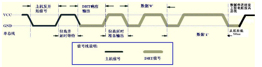 DHT11是通过单总线与单片机进行通信的,这样做的好处就是占用资源少,编程实现简单,发送数据的具体格式为 8bit 湿度整数数据+8bit 湿度小数数据+8bi 温度整数数据+8bit 温度小数数据+8bit校验和。主机先要给DHT11发送一个启动新号,等待DHT11做出响应,然后再进行检测温湿度的发送及传输,下面通过一张图来了解一下DHT11的传输过程。