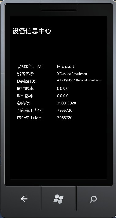 在模拟器中启动程序后,我们就可以看到文章最上面的系统信息显示了。因为我们使用的是模拟器,所有Device ID是并不是一个真实的硬件唯一标识。如果在WP7真机上运行该程序,那么Device ID、硬件版本、固件版本都会是真实值。尝试下吧.............