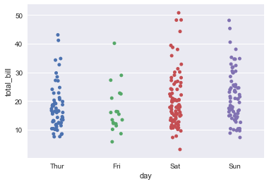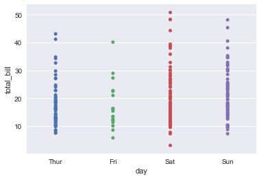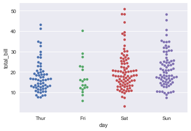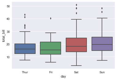 在某种程度上,类别型数据的可视化可能会无法反应某类中信息的一个分布情况,例如上面的day和total_bill的情况,在很多情况下较难看出究竟哪一天total_bill的好一点,尤其在两个类别中total都相近的时候(Sta,Sun),那此时我们就需要另外一些更好的可视化工具来帮助我们完成这些任务.