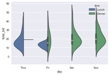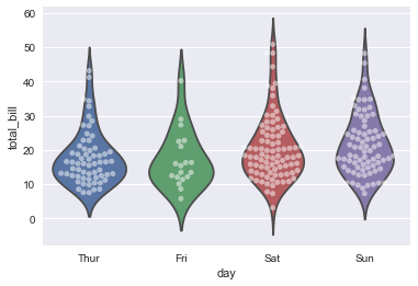 sns.violinplot(x="day", y="total_bill", data=tips, inner=None) sns.swarmplot(x="day", y="total_bill", data=tips, color="w", alpha=.5);