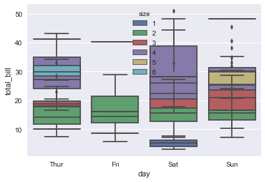 sns.boxplot(x="day", y="total_bill", hue="size", data=tips, dodge=False);