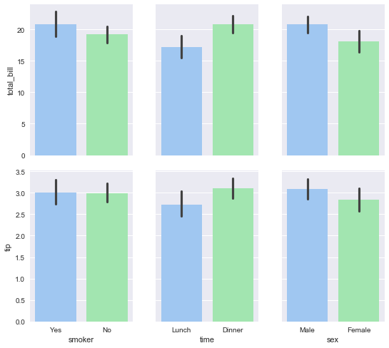 g = sns.PairGrid(tips,x_vars=["smoker", "time", "sex"],y_vars=["total_bill", "tip"],aspect=.75, size=3.5) g.map(sns.barplot, palette="pastel");