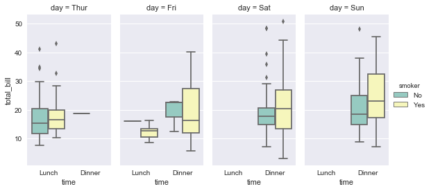 sns.factorplot(x="time", y="total_bill", hue="smoker",hue_order=["No","Yes"] ,col="day", data=tips, kind="box", size=4, aspect=.5, palette="Set3");