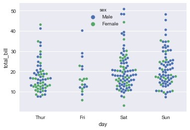 sns.swarmplot(x='day',y='total_bill',hue='sex',data=tips)