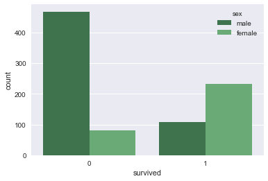 sns.countplot(hue='sex',x='survived',data=titanic,palette='Greens_d')